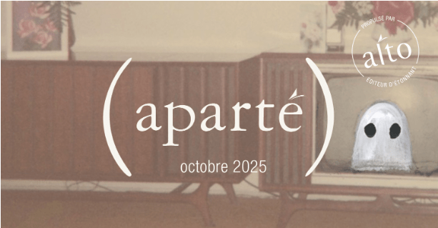 La voix d’Alto. Un magazine où on découvre des inédits, des entretiens, des extraits, des confidences, des portfolios. Une infolettre qui propose à ses abonné·e·s des concours, des surprises et des primeurs. Un balado qui offre une fenêtre sur les métiers du livre et leurs aspects les plus méconnus. Merci de lire Alto. Merci de partager cet (aparté) avec nous.